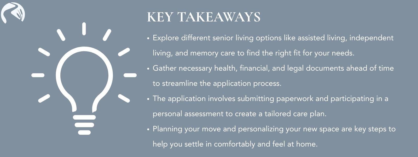 Each senior living community has its own application forms, which you can request from the team. Take your time filling them out, ask questions if anything is unclear, and submit the paperwork when you’re ready. This is your chance to share what you are looking for in a new home.